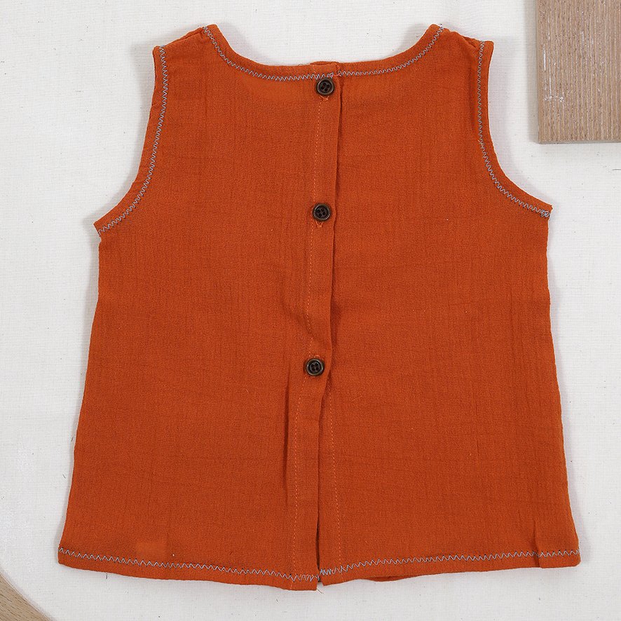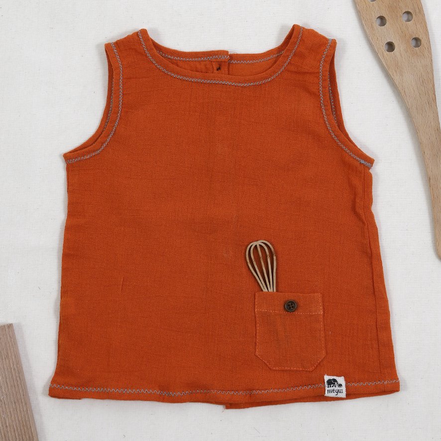 Musculosa Cosquillas con 3 botones de madera reciclables en espalda y botón fijo de madera reciclable en el bolsillo frontal. Detalle costura zigzag en color celeste.