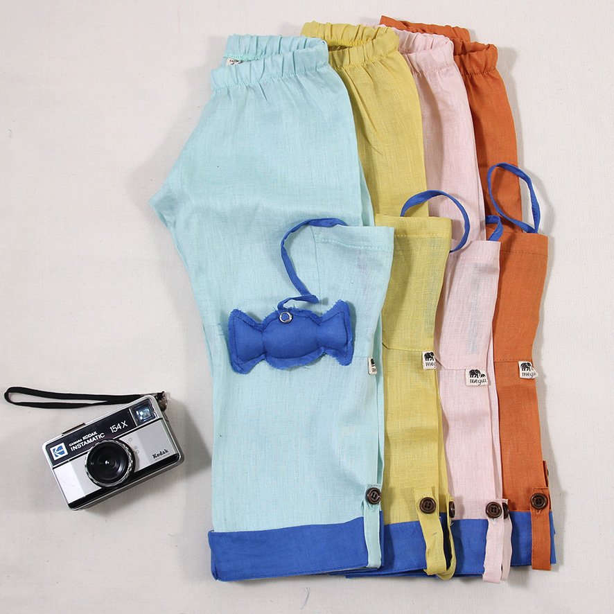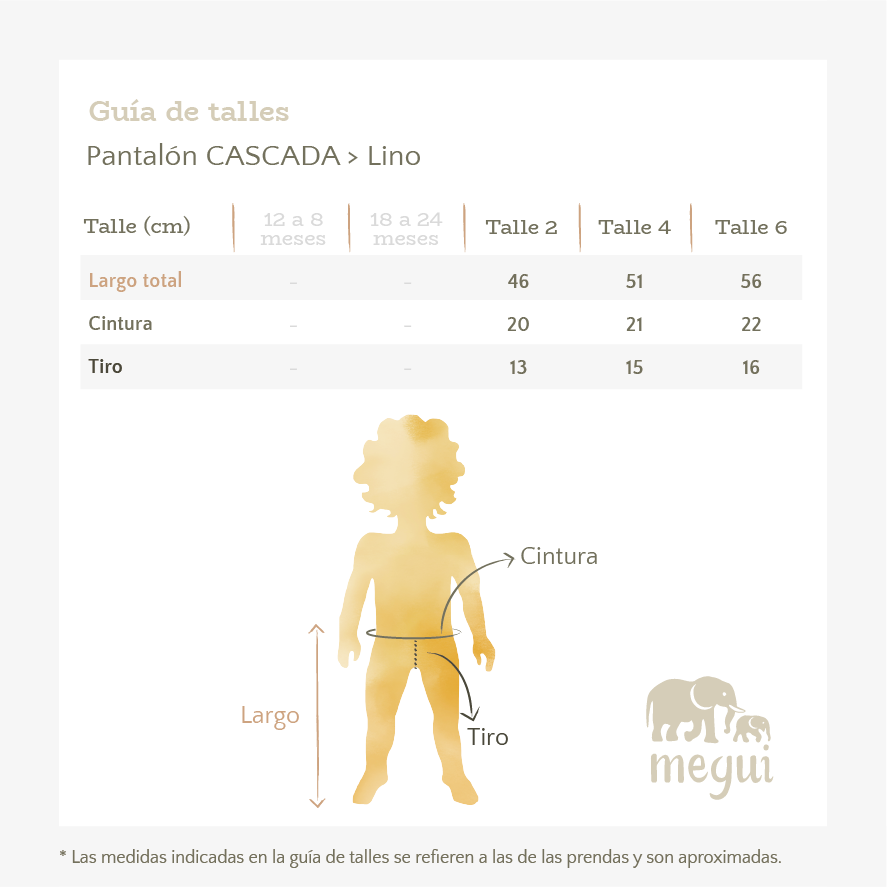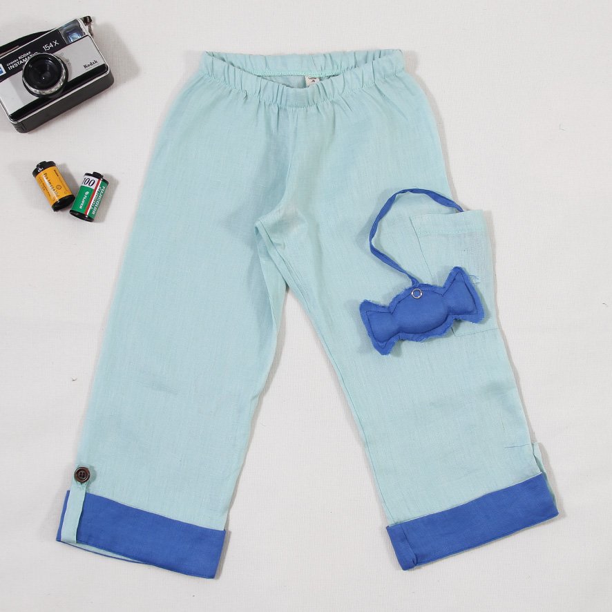 Pantalón Cascada con botamanga en color azul desmontable de 4 centímetros que permite prolongar su uso.