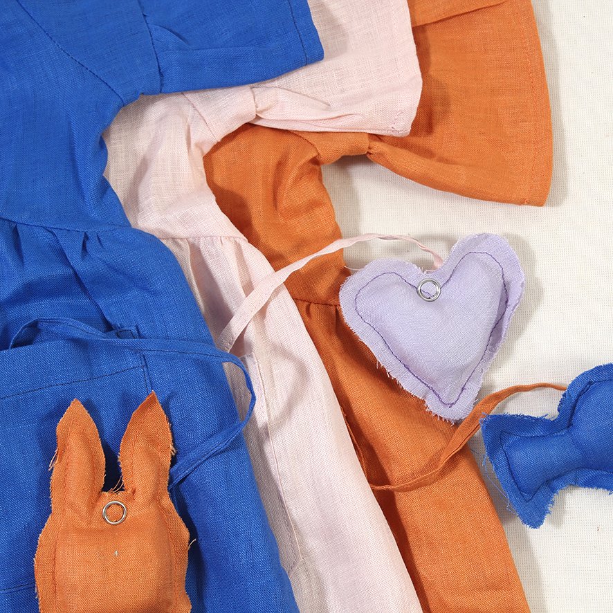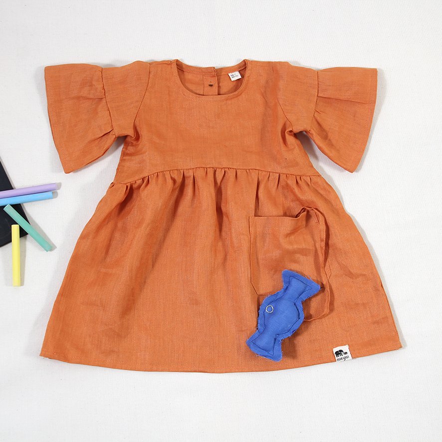 Vestido Cielo con juguete desmontable en bolsillo. Botón de madera reciclable en la espalda para cierre.